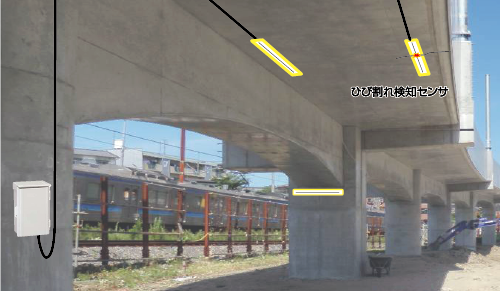 コンクリート構造物の、劣化・損傷などにより、コンクリート表面に発生したひび割れを高所や暗所でも容易に正確に発見できるセンサです。ひび割れ検知センサをコンクリート構造物に貼付け光ケーブルに可視光源をセットします。ひび割れが発生すると検出部の光ファイバーが断線し光源の光が漏れ発光しひび割れの発生位置を確認できます。
